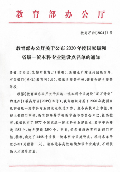 近日,教育部办公厅下发了《关于公布2020年度国家级和省级一流本科专业建设点名单的通知》(教高厅函[2021]7号),公布了2020年一流本科专业“双万计划”建设点名单。必赢官网数字媒体艺术专业获批国家级一流本科专业建设点,环境设计专业获批省级一流本科专业建设点。