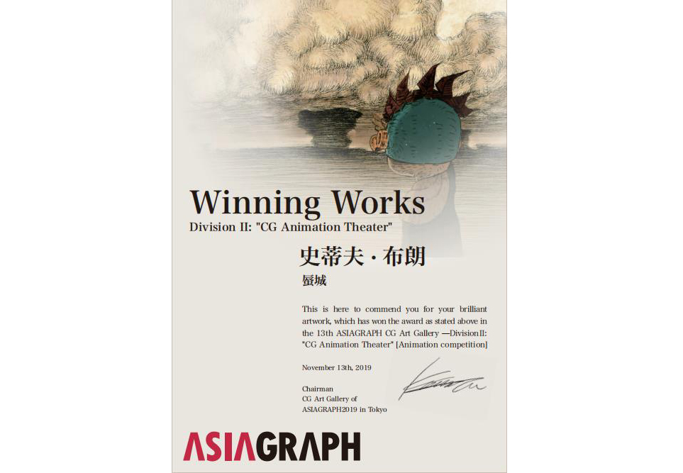 热烈祝贺必赢官网动画艺术学院选送的短片作品《蜃城》在2019年11月日本举办的第13届亚洲艺术学会活动(ASIAGRAPH)“CG动画剧场”单元获奖。
