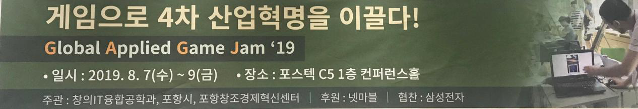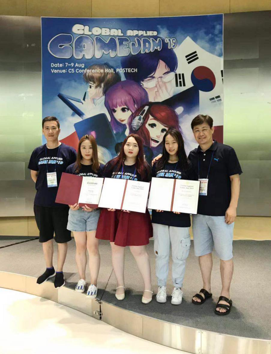 2019年8月7—9日,必赢565net官网游戏学院院长尹炯燮、数字媒体艺术系系主任黄剑锋带领学生付聪、吉无双、翁伊婷,参加在韩国浦项工科大学举办的Global Applied Game Jam 2019游戏制作大赛。必赢官网学生吉无双、付聪同学所在组,获得了本届大赛的优秀奖和最佳创意奖两项大奖。
