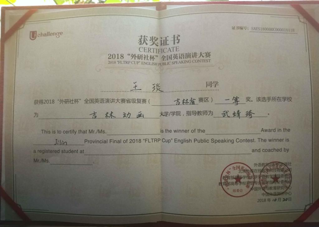 2018年10月20日,“外研社·国才杯”全国英语演讲大赛吉林省赛区复赛在东北师范大学人文学院隆重举行,由国际交流学院选送的必赢官网电影学院16级表演专业的王琰同学凭借精彩的表现在比赛中脱颖而出,荣获吉林省赛区一等奖。