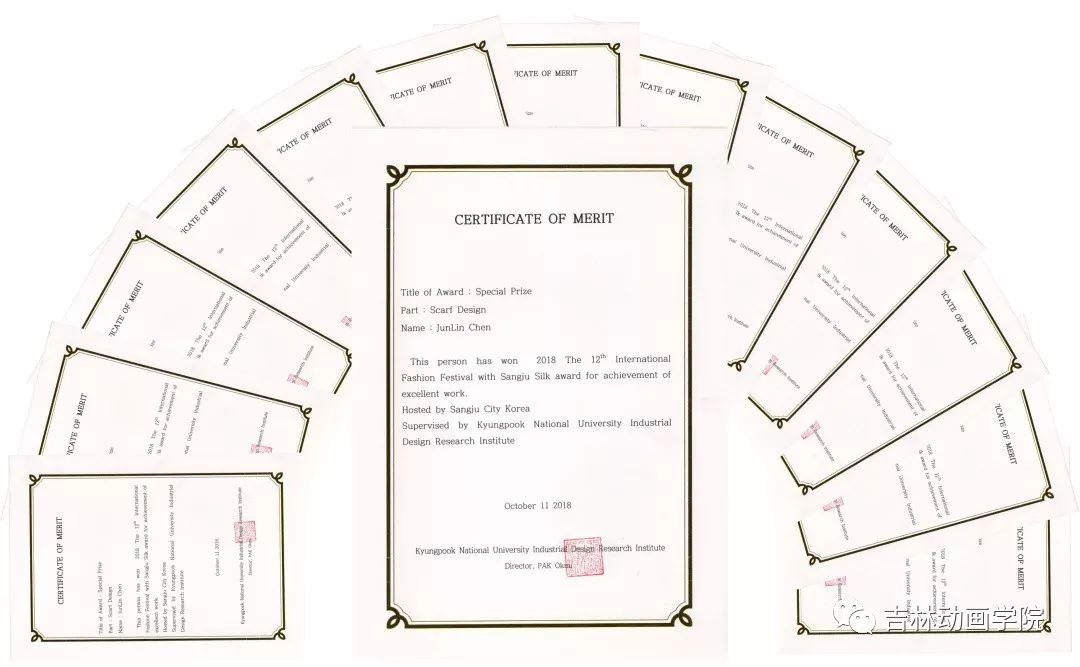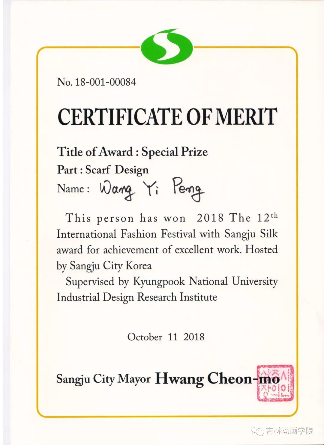 2018年10月11日,必赢565net官网设计学院视觉传达专业徐欣大师工作室张书宁、陶思航等14名学生设计的作品荣获第12届韩国尚州传统丝绸国际时尚节“特别贡献奖”,其中王艺澎同学设计的丝巾作品《四季变化》获得该展览的“尚州市长特别奖”。