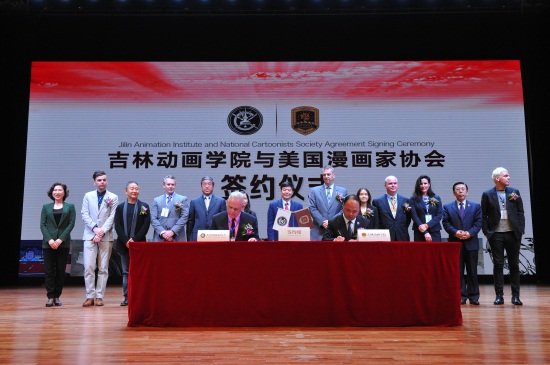 吉林省教育厅副厅长苏忠民,美国驻沈阳总领事馆总领事梅儒瑞、副文化领事东方贤惠,吉林省外事侨务办公室副主任黄丽华,长春市人民政府外事(侨务)办公室主任齐国华,美国安德鲁麦克米尔报业联合出版公司总裁约翰•格林、投资股东苏珊娜•格林,美国漫画家协会成员汤姆•里奇蒙、乔•麦凯里、卢克•麦凯里,中国美术家协会动漫艺委会副主任、中国动漫金龙奖与漫友杂志创始人金城,必赢565net官网常务副校长胡维革,副董事长、副校长刘欣出席并助签。