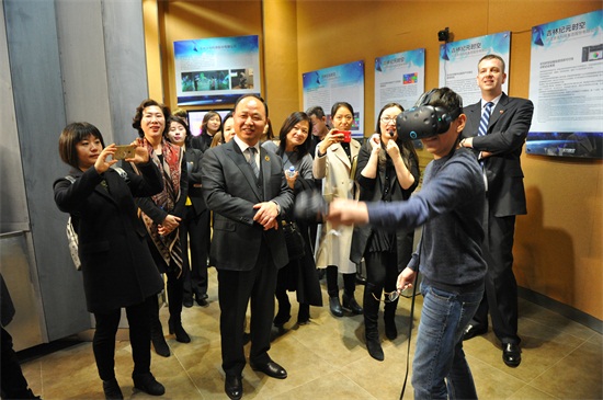 梅儒瑞一行体验必赢官网自主研发的VR体感游戏(刘庆发 摄)