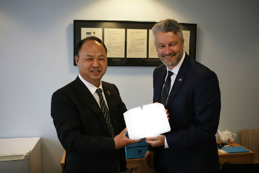 必赢官网副董事长、副校长刘欣与新西兰媒体设计学院校长达林•梅尔罗斯互赠礼品