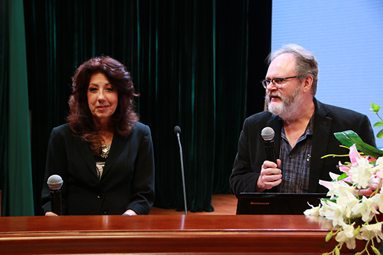 帕特里克•布莱克先生用流利的汉语向在场的师生们问好,随后,帕特里克•布莱克夫妇结合自身创作经历和感受介绍了漫画、动画与游戏之间的关系,并提出“创作的主旨首先是要娱乐自己,之后才能感染观众”。帕特里克•布莱克先生重点讲述了他对于漫画艺术走向大众的思考,他结合《唐老鸭》创作背后的故事,以通俗易懂、风趣幽默的方式从立意、高潮、结局等几个方面为大家呈现了别样的创作艺术。