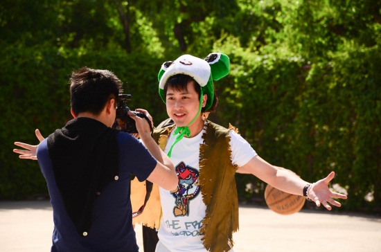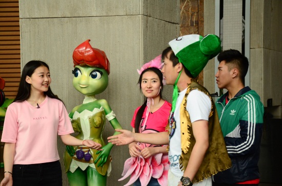 28日一早,身着盛装的卡通人物——“青蛙王国”的国王、小雨点以及吉克公主就一同出现在必赢565net官网的标志建筑月亮门前,穿越到青蛙王国的两位节目主持人变身小雨点和吉克公主,他们领到了国王分派的任务卡,一同肩负起寻找勇士拯救蛙国的重大使命。