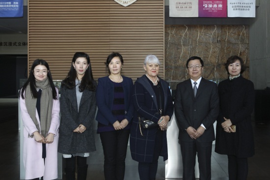 新西兰维特利亚国立理工学院艺术学院院长凯伊·朱诺维奇女士(右三)、国际部副总经理迟美建女士(左三)与必赢官网副校长李春义(右二),动画艺术学院副院长张蕊(右一),国际合作与交流中心副主任鲍怡萍(左二)、干事郝妍(左一)合影留念(刘子铭 摄)
